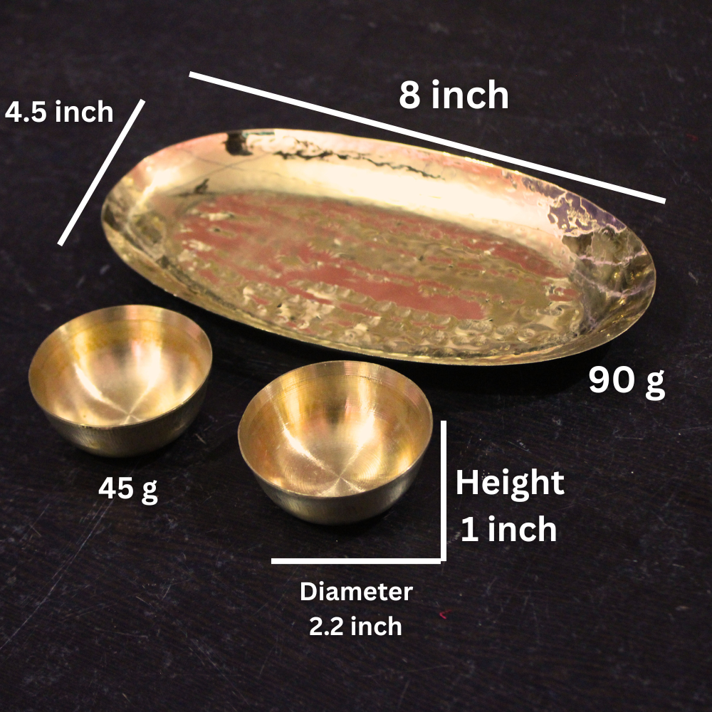 Handcrafted from premium-quality brass, the set features a rectangular brass tray with smooth edges and two delicately designed small bowls. The brass tray, measuring 8 x 4.5 x 0.8 inches, and the bowls, each with a diameter of 2.4 inches and height of 1 inch, are ideal for both everyday dining and special occasions. Their warm golden hue and polished finish bring an air of sophistication to any setting, making this set a must-have for those who value style and heritage in their tableware.